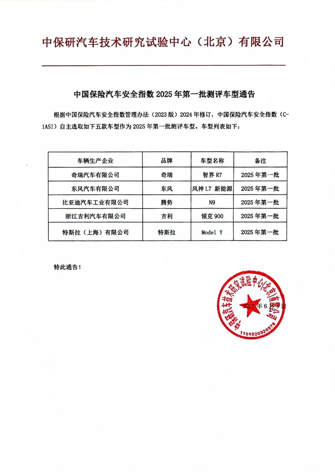 中保研公布今年首批测评车型:智界R7、腾势N9、特斯拉Model Y等